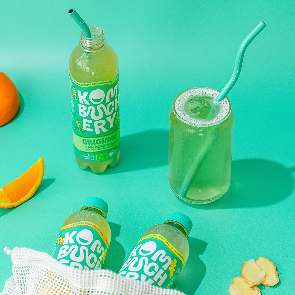 Unsere Abfüllung erfolgt unter höchsten Hygienestandards und mit größter Sorgfalt, damit jede Flasche Kombucha frisch und hochwertig bleibt, wie sie unsere Brauerei verlässt. Für unsere neue Verpackung setzen wir auf Flaschen aus 100 % recyceltem PET – leicht, bruchsicher und ideal für unterwegs. Trotz ihres geringeren Gewichts bieten sie mehr Inhalt als bisher – für noch mehr Genuss. Dank Einwegpfand lässt sich die Flasche bequem überall zurückgeben und kommt zurück in den Recyclingkreislauf. So sparen wir Ressourcen, reduzieren CO₂ und machen bewusstes Konsumieren noch einfacher. Jede Flasche wird sorgfältig versiegelt, damit du unseren Kombucha genauso genießen kannst, wie er gedacht ist – erfrischend, vollmundig und mit einem guten Gefühl.